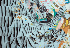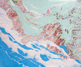 This project is about story-telling. The pieces tell stories of places around Greenland and their topographical features. The bedrock of each piece is a printed geological map donated by the Geological Survey of Denmark and Greenland (GEUS). These maps colourfully portray the geological diversity of Greenland’s ancient landscapes. While the maps define the geology and boundaries of these regions, the collage emphasises their modern stories. What dynamism is evident in the landscape? What is the ice doing to the terrain? How, and why? Here, the human component experiences the pushback of nature. The speed of ice-flow, the rapidity of the changing landscape, is clearly influenced by anthropogenic climate change.